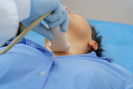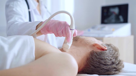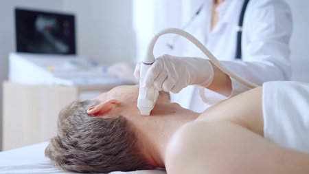 A male patient undergoes an ultrasound examination of his neck, performed by a doctor using a transducer. Medical monitors display the diagnostic images in a clinic setting.