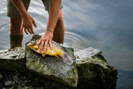 The fisherman holds a fish in his hands, summer fishing. carp