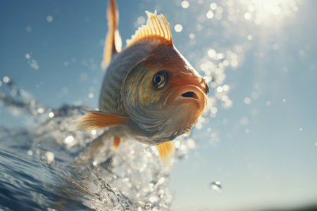 Gentle splash of fish jumping out of water captured in mid-air , Professional stock photo, AI generated photograph