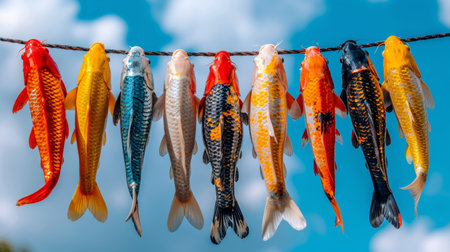 Koi fish hanging on a rope with blue sky and white clouds. Concept of Celebrate Golden Week in Japan or National Koi Day
