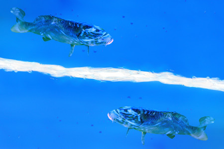 Abstract background. Two fish swim in a blue liquid.