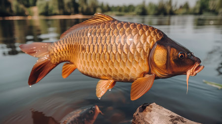This captivating close-up of a freshwater fish showcases its vivid features against a tranquil lake backdrop, highlighting the beauty of nature and wildlife.