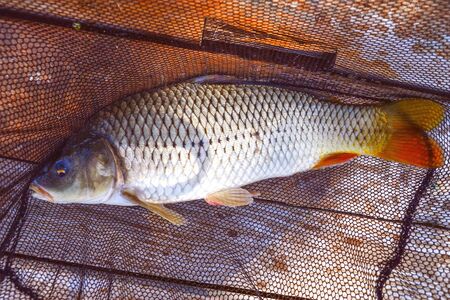 Close up of carp fish in a fishing net on a sunny day