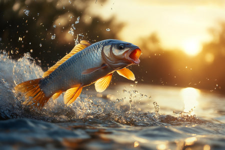 A fish is jumping out of the water, creating a splash. Concept of movement and energy, as the fish leaps into the air. The water droplets in the air add a dynamic and lively atmosphere to the scene