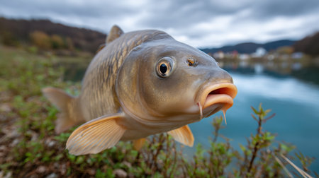 This captivating close-up of a freshwater fish showcases its vivid features against a tranquil lake backdrop, highlighting the beauty of nature and wildlife.