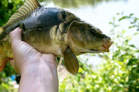 caught mirror carp in hand against the lake