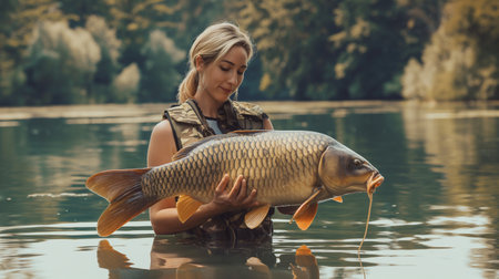 Beautiful girl with a big carp in her hands on the lake
