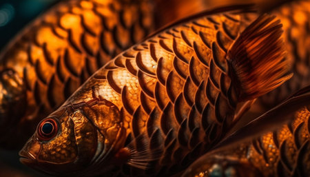 A magnificent golden fish glides through tranquil, dark water, its scales catching the light like a thousand tiny coins. The shimmering bokeh background creates a dreamlike atmosphere, highlighting the creatures rare and precious beauty, evoking a sense of wonder and luxury.