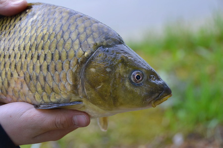 picture with the role of a successful fisherman - carp, green grass in the background
