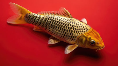 A close-up shot showcases a koi fish with vibrant golden and black scales set against a rich red background. The fish is displayed in a studio setting with bright, even lighting. The image suggests potential uses in design projects, editorial content, and decorative applications.