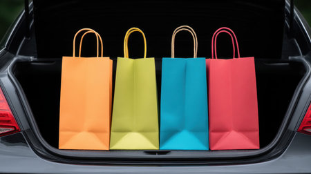 Bright and colorful shopping bags arranged neatly in an open car trunk, highlighting a fun shopping trip. Ideal for themes of retail and lifestyle.
