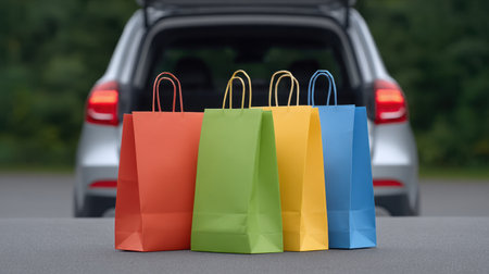 A visually appealing arrangement of colorful shopping bags is showcased prominently in front of an open car trunk, set against an urban backdrop.
