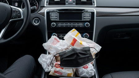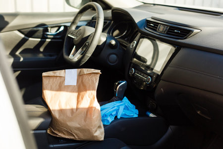parcels in boxes in the car outdoors. Take-out concept. Online shopping. mock up. Service coronavirus.