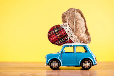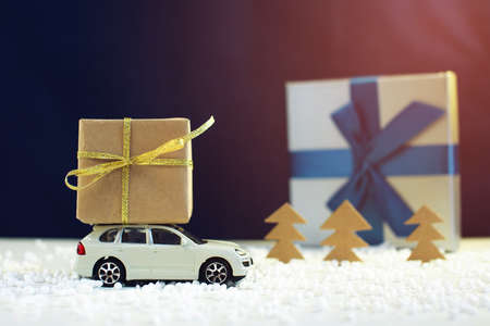 Miniature of a small Christmas car. Toy small Christmas cars with luggage.