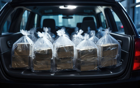 shopping bags in car trunk at mall parking in winter, ai generated.