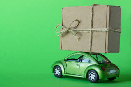Green toy car delivers a parcel in a craft cardboard box on a pastel green background. Delivery of goods, gifts or donation concept.