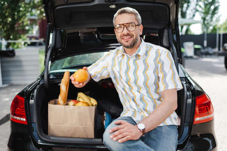 Smiling man holding orange near shopping bag with food and open car trunk on urban street