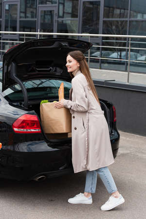 pretty woman in trench coat putting shopping bag with grocery in car trunk