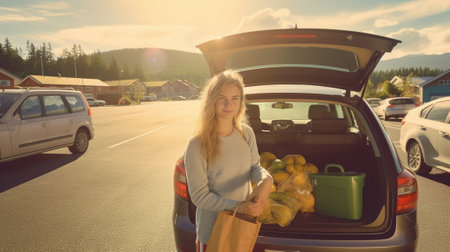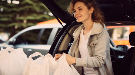 Woman loading shopping bags and groceries in a car trunk after going shopping.