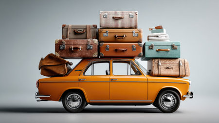 A vibrant orange vintage car with an artistic arrangement of various luggage pieces stacked high, showcasing travel themes, adventure spirit, and nostalgia.