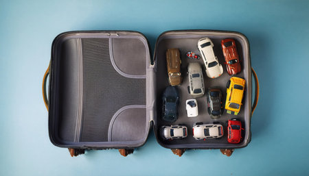 Modern suitcase features a tidy arrangement of colorful toy cars, demonstrating an organized and playful approach to packing for travel adventures.