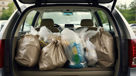 Family car trunk filled with shopping bags and supplies in mall parking area with copy space