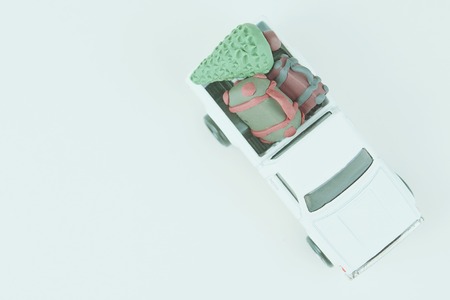 Small purple and white pickup automobiles on table. Car toy models with suitcases and christmas tree. Miniature fir and briefcases made of polymer clay. Concept of festival travel and vacation.