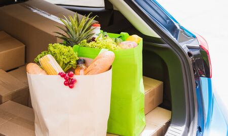 Grocery service giving fresh vegetables and fruits and food in green cloth bag and wooden basket on the back car ready delivery to send woman customer