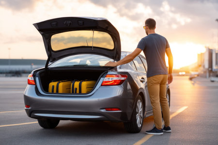 Tourist is closing car trunk after loading luggage at airport parking at sunset, ready for his travel