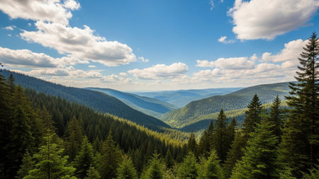 Mountains hills landscape during a sunny day with blue sky clouds. Dark autumn trees. Forest in summer. Hiking in wild mountains. Adventure Local Travel Concept.