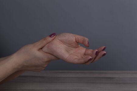 Woman suffering from hand pain or finger pain. Hand numbness or limb numbness. Massaging painful hand