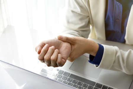 Arthritis person, finger woman ache from working in office. Concept office syndrome hand pain from occupational disease, woman having wrist pain from using laptop computer, wrist pain.
