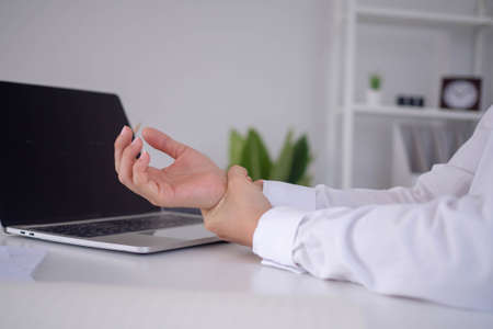 A person is holding on to the wrist, which comes from pain from work, pain from sitting and typing at a computer for a long time, causing pain in many areas of the body. Office Syndrome concept.