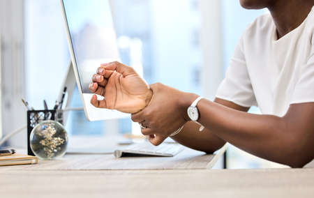 I need to give my wrist a break. Shot of an unrecognizable businesswoman suffering from wrist pain at work.