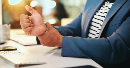 Night, person and hands in office with joint pain, overworked muscle and carpal tunnel syndrome. Businessman, wrist injury and tension in workplace with burnout, deadline pressure and massage at tech