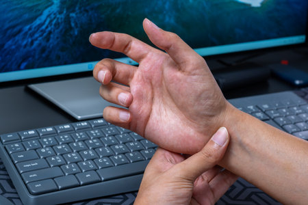 Wrist pain, muscle strain, and nerve injury from poor office ergonomics—caused by repetitive computer use. Workplace RSI and strain awareness. Office syndrome.