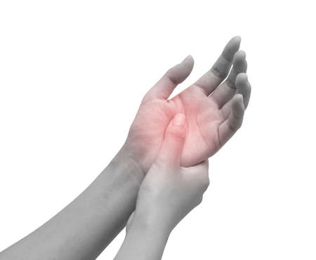 Joint and elbow injuries, fatigue at work. Area of the injury, the image on a clean background. Spasm on the man's wrist.