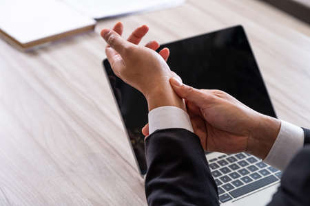 Selective focus at hand of business man wearing formal black suit while touching his hand and wrist with pain after using laptop computer. Office syndrome caused from overwork or wrong posture.