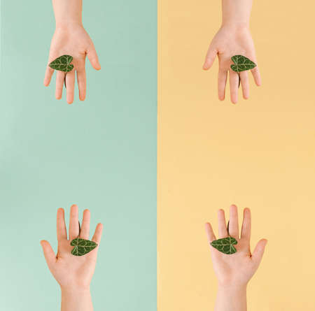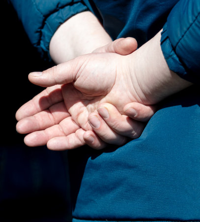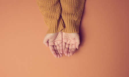 Two women's hands are folded in a boat asking for alms. Selective focus. Close-up