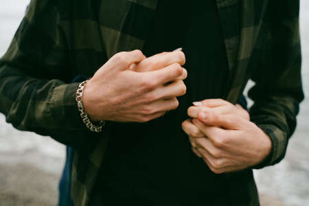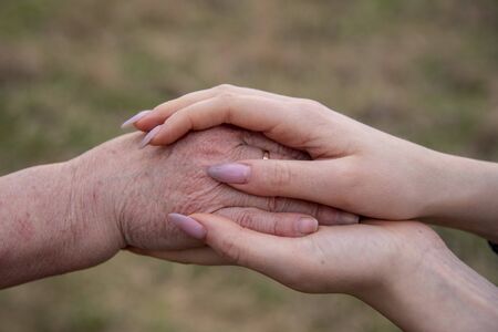 Close-up of the hands of a man and a woman. Male hands stroking the hands of a young woman stroking. Love and support concept