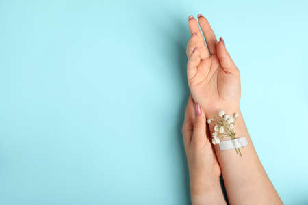 Female hand with forget me not or scorpion grass flowers applied with patch on white background, top view with copy space. Wellness or cosmetics concept, spring floral aesthetics. High quality photo