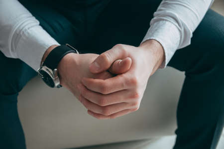 The medical worker gathered his hands in fists. On white background. Language of the body.