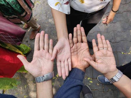 Pile of hands of friends. Teenagers putting their hands together. Close up