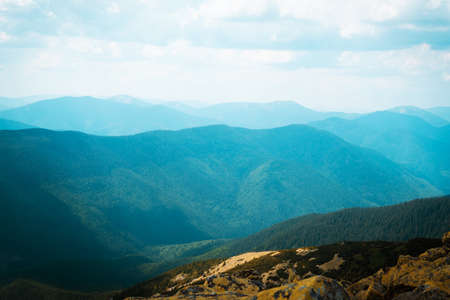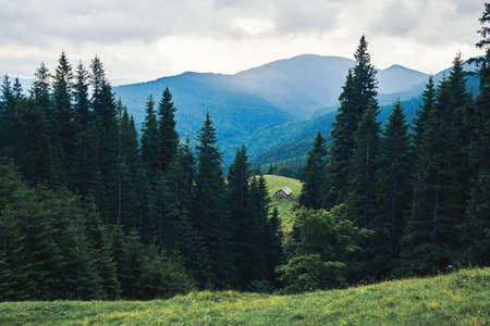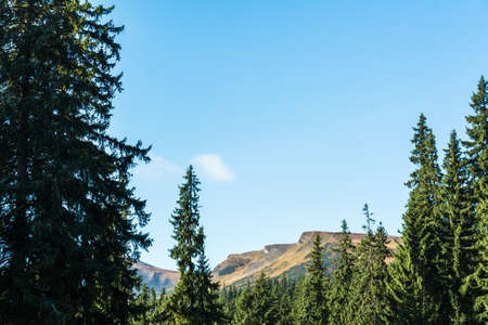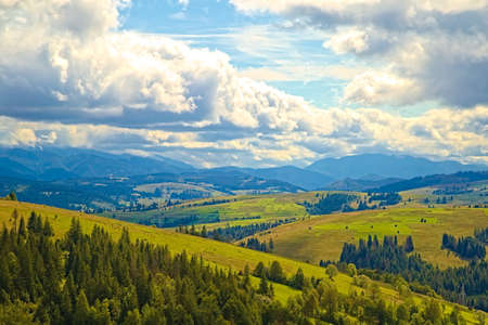 Beautiful mountain scenery with hills at sunny day. Mountain top among clouds in a sky. The tops of tall trees in a pine forest. Green meadows with lush grass. Beautiful nature. Ukrainian Carpathians.