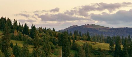 Beautiful mountain landscape at sunrise. View of hills covered forest in sunlight. Filtered image: Soft and vintage effect.