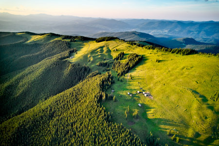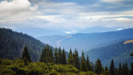 Summer landscape in Romania. Distant mountain range and thin layer of fog on the valleys. Coniferous forest and small houses on hillsides in the Eastern Carpathians.