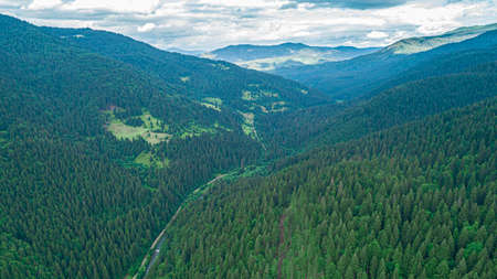 aerial view of carpathian mountains with river summer time