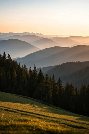A stunning mountain landscape showcasing rolling hills, lush meadows, and towering evergreen trees under a dramatic sky. Serenity and peace.