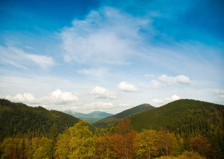 Carpathian pine forest hills landscape under majestic blue sky with high clouds.