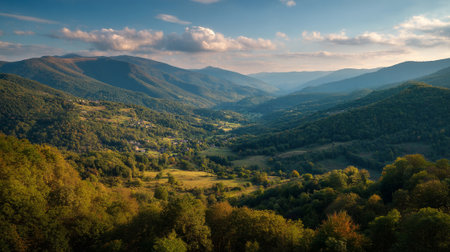 Picturesque Mountain Valley Landscape with Lush Green Forests Under a Partly Cloudy Sky
